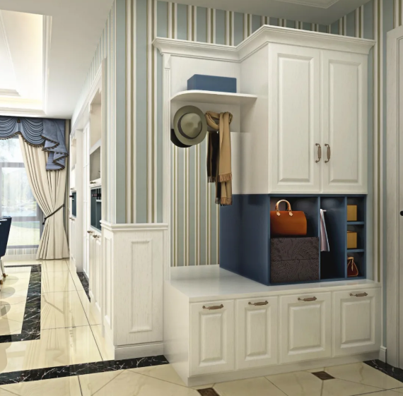 病毒細菌喜歡依附在鞋子、帽子和外套上,所以在設計時可以考慮一個置頂?shù)囊鹿?,通過格柵把鞋子和外套分隔開,不僅方便還實用。有必要的話還可以在柜子的一側(cè)放置衣簍,切記,外套衣服在放置時一定要反著掛。