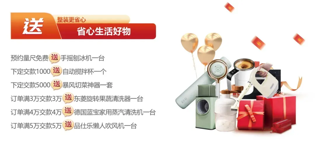 超值定制套餐,引領(lǐng)品質(zhì)生活。此次活動套餐包含16800元整廚定制尊享套餐,配備德意品牌的高端煙機灶具,讓您的廚房煥然一新,烹飪更加便捷高效;4980元整衛(wèi)定制優(yōu)選套餐,包含浴室柜、智能馬桶、意大利進口奢華花灑以及精選衛(wèi)浴,讓您在忙碌之余享受片刻寧靜與舒適;以及38800元整家定制豪華套餐,涵蓋20㎡多層凈芯板全屋定制以及13件套高顏值軟裝搭配,從儲物到裝飾,全方位滿足您的個性化需求,讓您的家既美觀又實用。