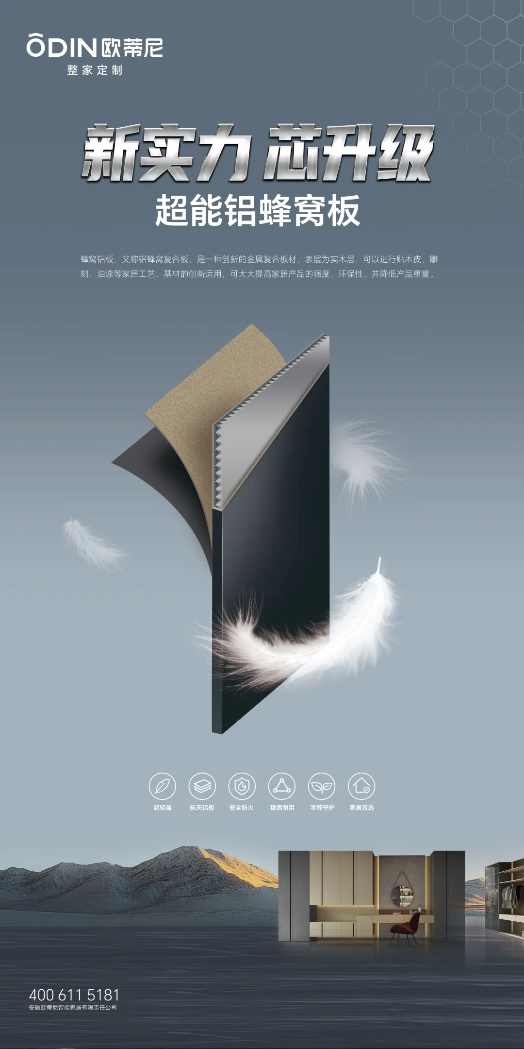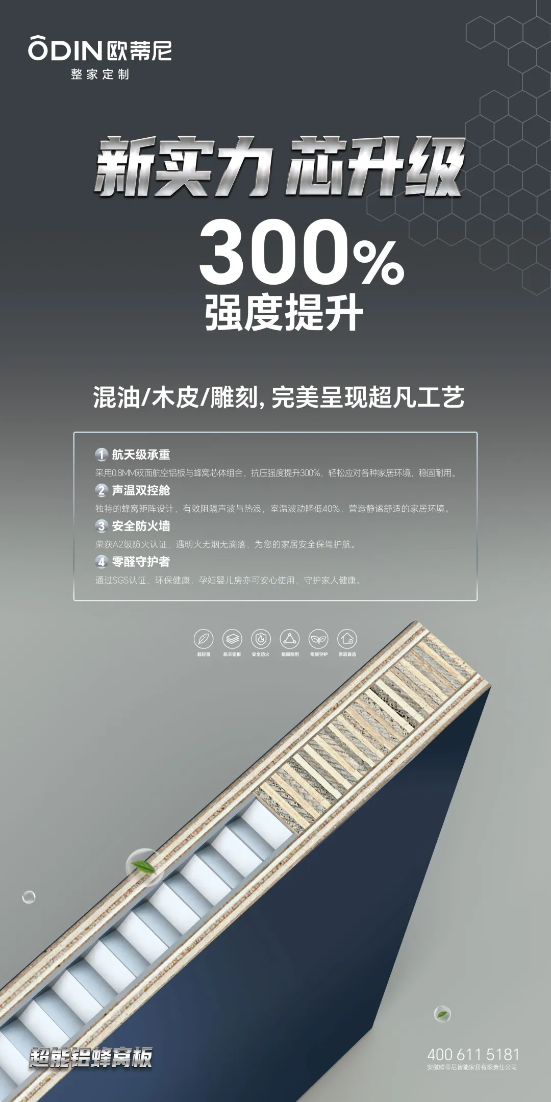 作為革新主角的歐蒂尼超能鋁蜂窩板,它不僅重新定義了家居材料的性能標準,更以材料科學(xué)賦能設(shè)計自由,讓家居解決方案從此突破傳統(tǒng)桎梏,更以其獨特的魅力引領(lǐng)著家居裝修的新風尚。下面,為大家重點介紹歐蒂尼的這款——超能鋁蜂窩板的核心優(yōu)勢。